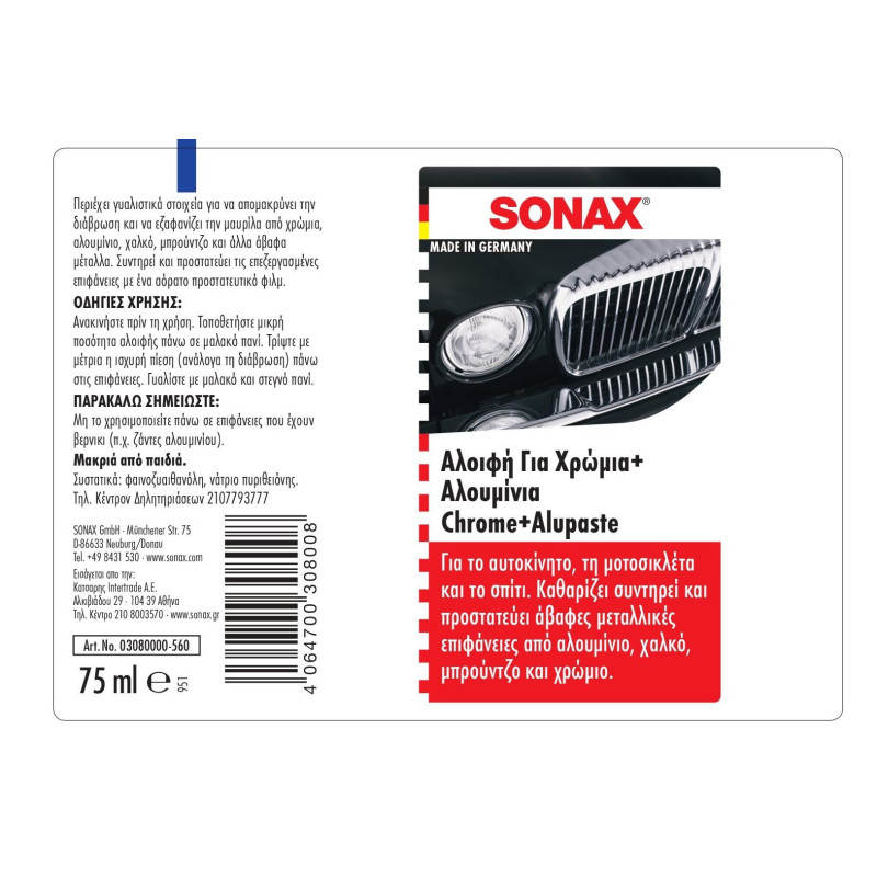 2108003570Λειαντική πάστα για την αφαίρεση σκουριάς, θαμπάδων και οξειδώσεων από χρώμιο, αλουμίνιο, ορείχαλκο, χαλκό και άλλα άβαφα μέταλλα. Διατηρεί και προστατεύει τις επιφάνειες με ένα αόρατο φιλμ προστασίας. Κατάλληλη για χρήση σε αυτοκίνητο, μοτοσυκλέτα και στο σπίτι.
